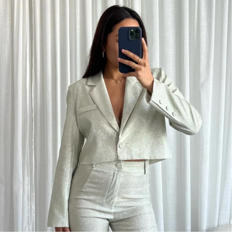 Deze glitter blazer is de ultieme feestdagen must-have! Perfect om te dragen op een stijlvolle jeans voor een casual chique look, of combineer hem met onze bijpassende glitter skort voor een complete, sprankelende outfit. De blazer is gemaakt van 100% polyester en heeft een feestelijke glans die gegarandeerd de aandacht trekt.